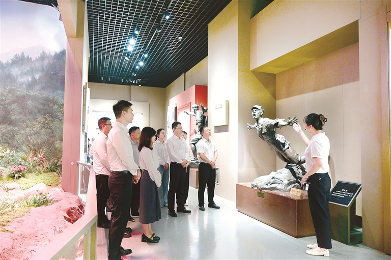 图为近日,在井冈山革命博物馆,江西省井冈山市纪检监察干部现场聆听讲解员讲述马义夫的英勇事迹。井冈山斗争时期,在一次战斗中,红军班长马义夫拖着中弹的双腿爬向敌军暗堡,用胸膛抵住敌机枪射孔,掩护部队冲锋,最终壮烈牺牲。段璐 摄