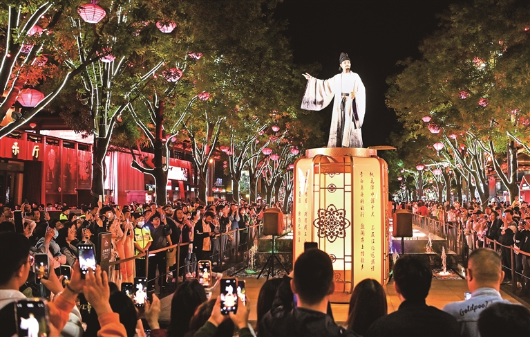 古典诗歌传承着我们这个民族千百年来生生不已的文化心灵。图为游客在陕西西安大唐不夜城与扮演“李白”的演员对诗。 新华社记者 邹竞一 摄