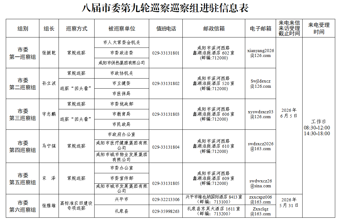 经市委批准,八届市委第九轮巡察组建6个巡察组,对11个市级部门和市属国有企业党组织开展常规巡察,对4个市级部门党组织开展巡察“回头看”,对2个县市高标准农田建设开展专项巡察,对其余10个县市区(不含渭城区)开展高标准农田建设联动专项巡察并进行指导督导。巡察期间,市委组织部、市委宣传部同步对被巡察单位开展选人用人和意识形态工作专项检查。截至2026年4月1日,市委6个巡察组全部进驻。