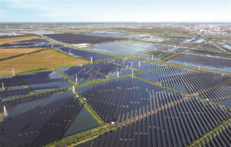 图为近日拍摄的河北省唐山市丰南区黑沿子镇一处“渔光互补”发电场和风电场遥相呼应的场景。新华社记者 杨世尧 摄