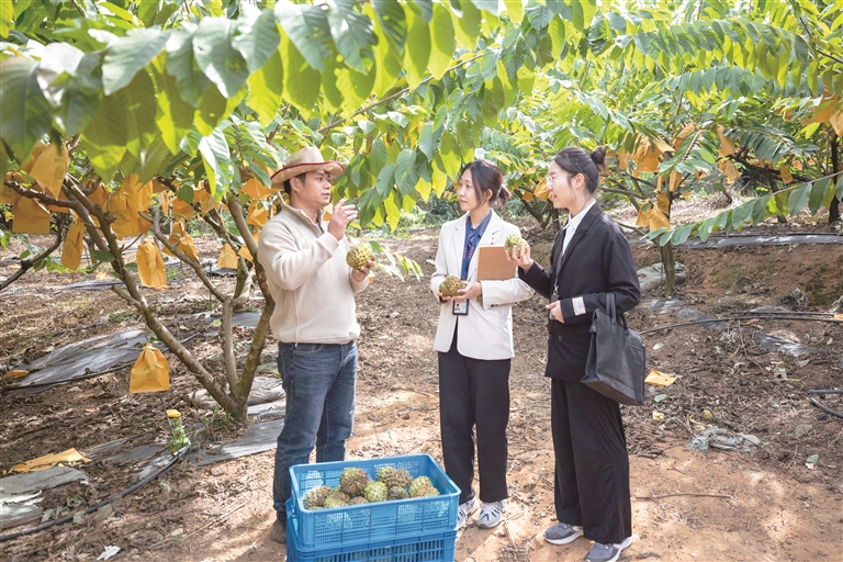 广东省四会市纪委监委把“百千万工程”作为政治监督的“头号工程”来抓,围绕产业发展、土地资金要素保障、干部作风等开展精准监督。图为近日,该市纪委监委干部到迳口镇释迦果种植基地走访了解有关情况。胡源 摄