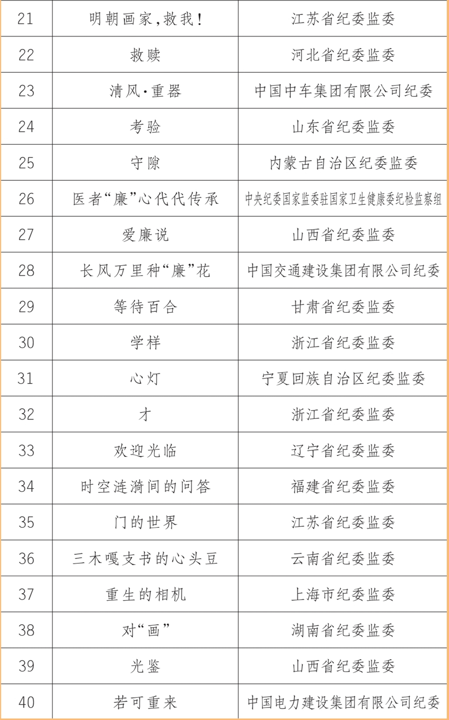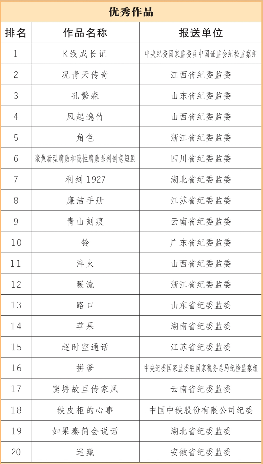 近日,由中央纪委国家监委宣传部、中央宣传部文艺局、中央网信办网络传播局联合主办,人民网承办的新时代廉洁文化微短剧征集展播活动,公布了20部优秀作品、40部入围作品(名单附后)。浙江省纪委监委、山西省纪委监委、中央纪委国家监委驻中国证监会纪检监察组等10家单位获评优秀组织单位。